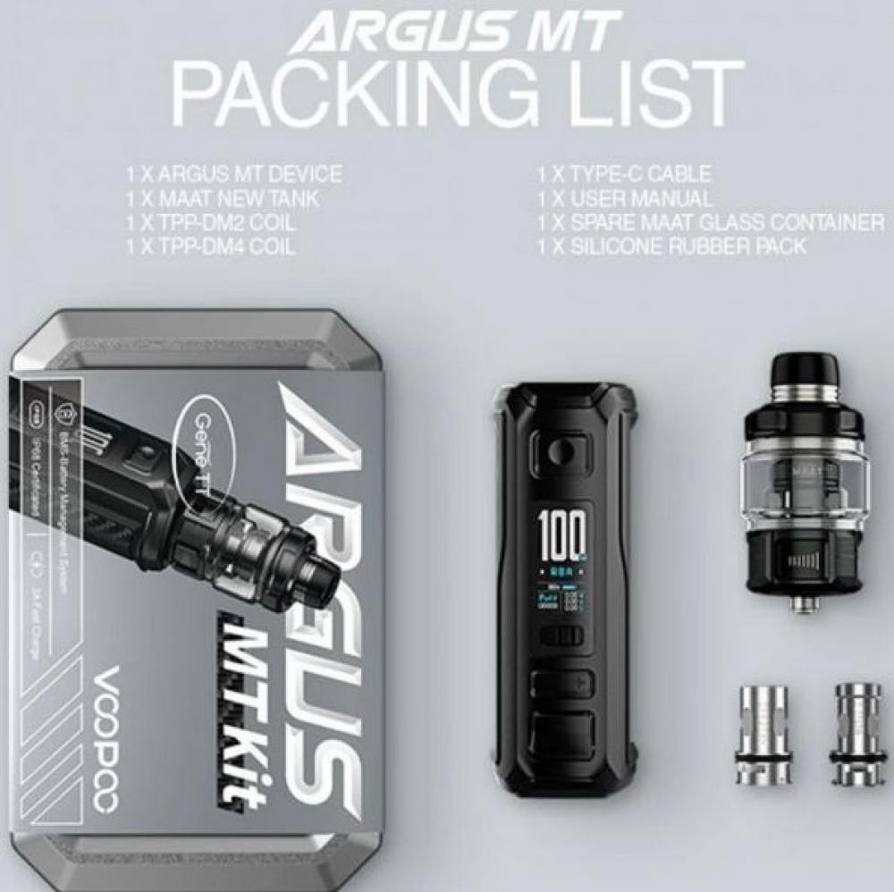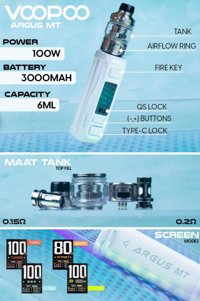 هذا الجهاز يخرج ما يصل إلى 100 واط بالإضافة إلى ذلك، يأتي VOOPOO Argus MT مقترنًا بدبابة MAAT. بفضل تدفق الهواء ثنائي الاتجاه يمكنك التحويل بسهولة الى DL عن طريق تقليل فقد تدفق الهواء بنسبة 60٪. بدعم من شريحة GENE.TT 2.0.