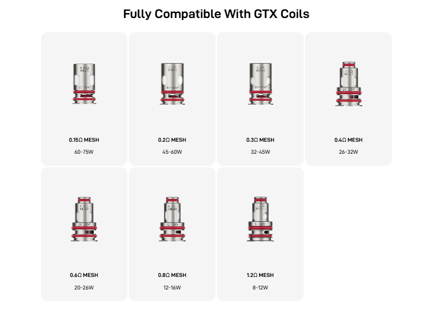 - كويل GTX 1.2Ω Mesh: من 8 إلى 12 واط (متوافق للسحب MTL)